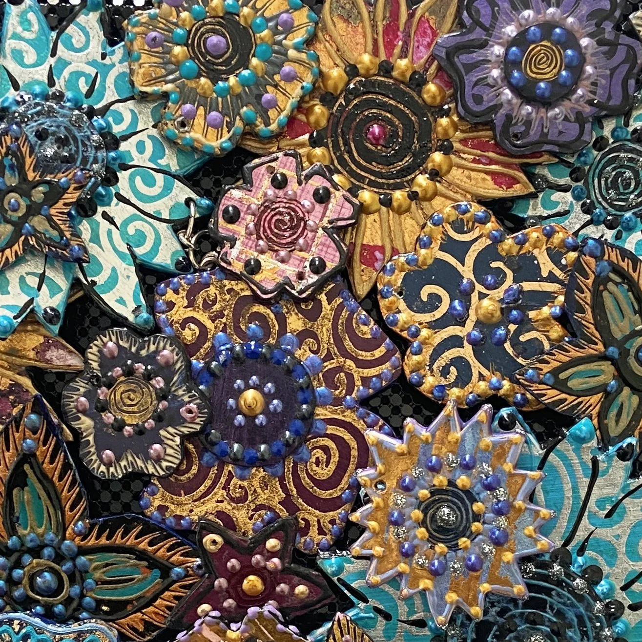 I make the charms of layers of paper glued together, cut into shapes and highly hand decorated on both sides with gold or silver leaf and paints, finished with coats of waterproof varnish so they are fine if you get caught in the rain!